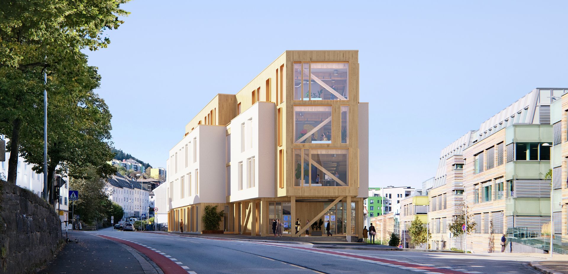 Bygget er tegnet av B+B arkitekter og har en fasade av tre og pusset mur som harmoniserer med området. De inntrukne fasadene i første, andre og femte etasje skaper også en god dialog med nabobebyggelsen.
